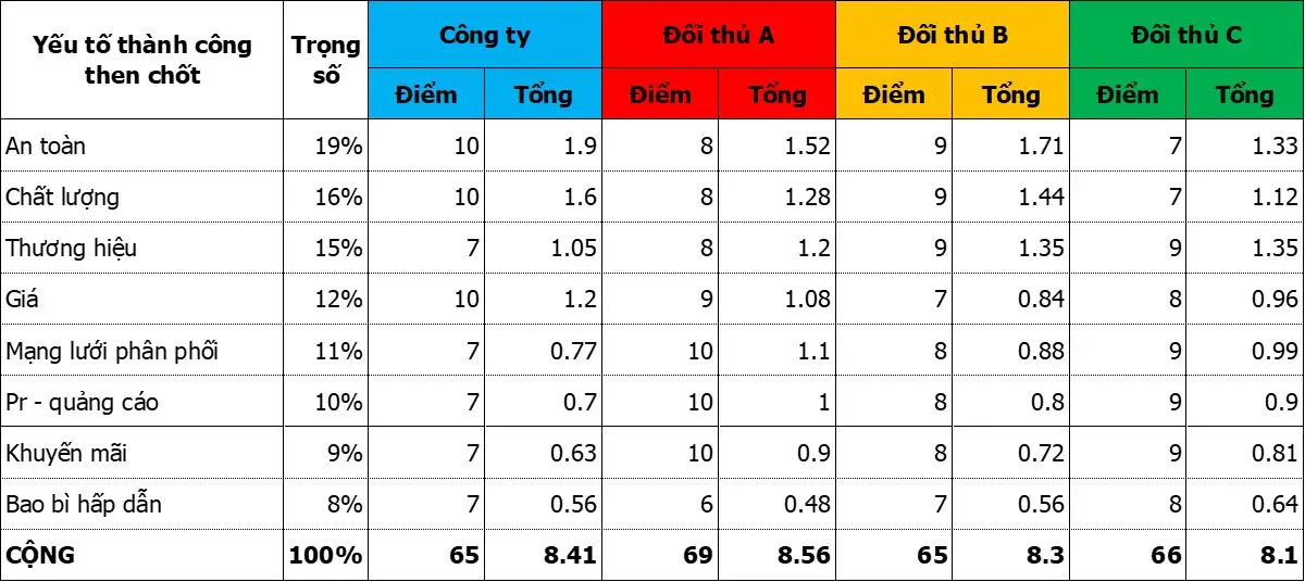 Công ty nào có tổng điểm càng cao đồng nghĩa khả năng cạnh trạnh để thành công của công ty đó càng cao trên thị trường. Ngược lại công ty nào có tổng điểm càng thấp thì khả năng cạnh tranh kém hơn.Xem thêm Đào tạo Mini MBA thực chiến
